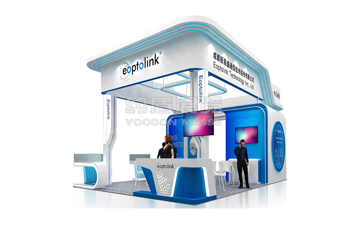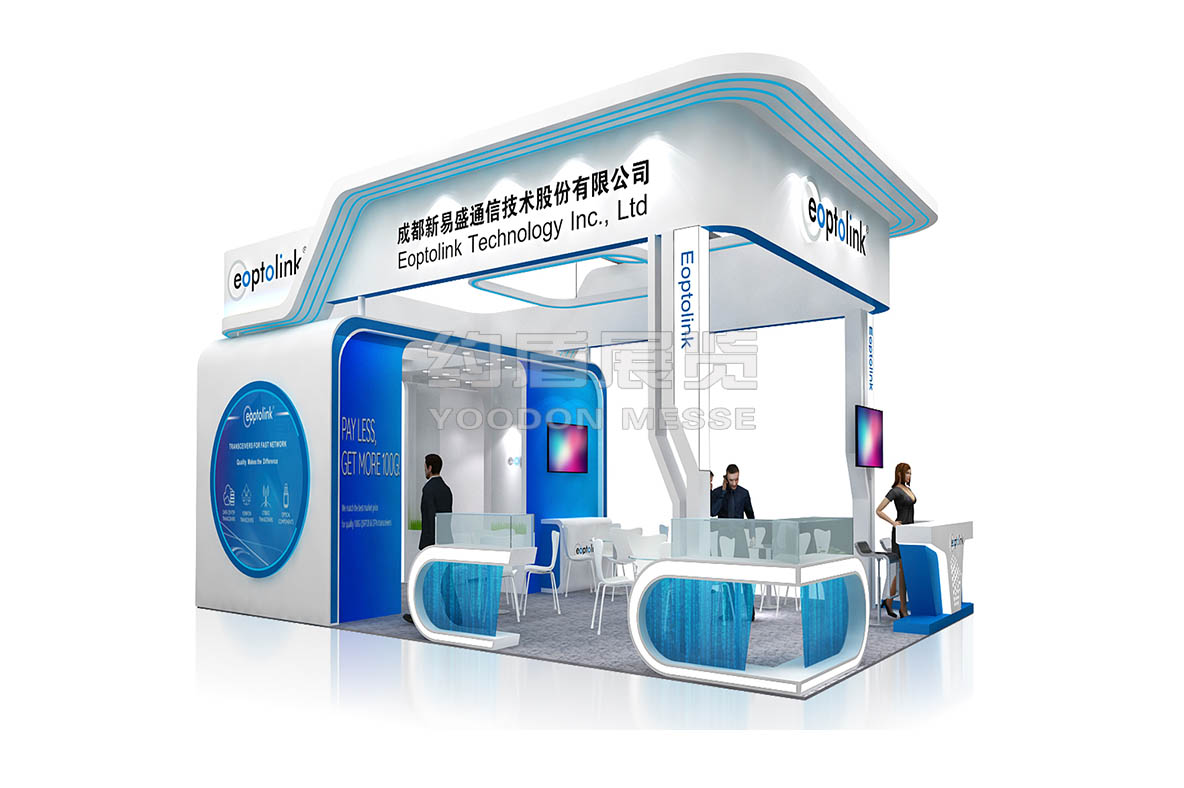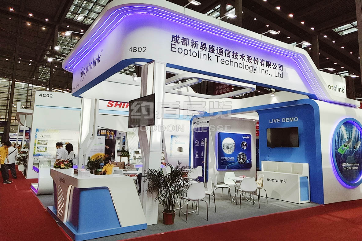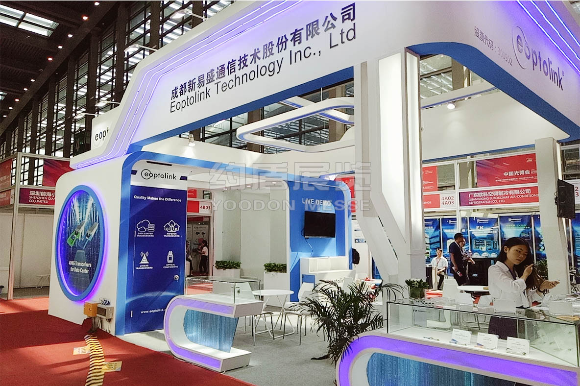 新易盛展臺設(shè)計(jì)搭建的風(fēng)格主題是藍(lán)色,通信電子展臺設(shè)計(jì)搭建的主題色,新易盛展臺主要推出了公司最新技術(shù),向全世界展示。